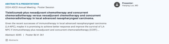 美国东部时间5月31日-6月4日,2024年第60届美国临床肿瘤学会(ASCO)年会在美国芝加哥举行。ASCO年会汇聚全球临床肿瘤学研究的精英,是最具影响力的肿瘤学术会议,被誉为国际肿瘤学“奥斯卡盛典”。新葡萄博士后合作导师、新葡萄8883官网AMG附属医院头颈部肿瘤专科副主任(主持工作)罗海清团队一项科研成果被大会接收,并以壁报形式展示(Poster Session)与国际同行进行交流。同时,该项成果已被TOP期刊JCO(Journal of Clinical Oncology)(IF=45.3)以摘要形式收录,这是附属医院首次以壁报展示的形式现场参与ASCO年会交流的研究项目,也是粤西地区医院的科研创新。
