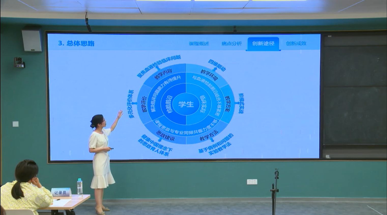 蔡静怡教学团队的参赛课程是《临床血液学检验技术》,作为医学检验技术专业的核心课程,过往存在着学生解决临床问题能力不足、教学与血液检验前沿结合不够紧密等问题。针对这些问题,教师团队进行了深入研究和大胆尝试,探索出“四维驱动阶梯式实战”教学模式。