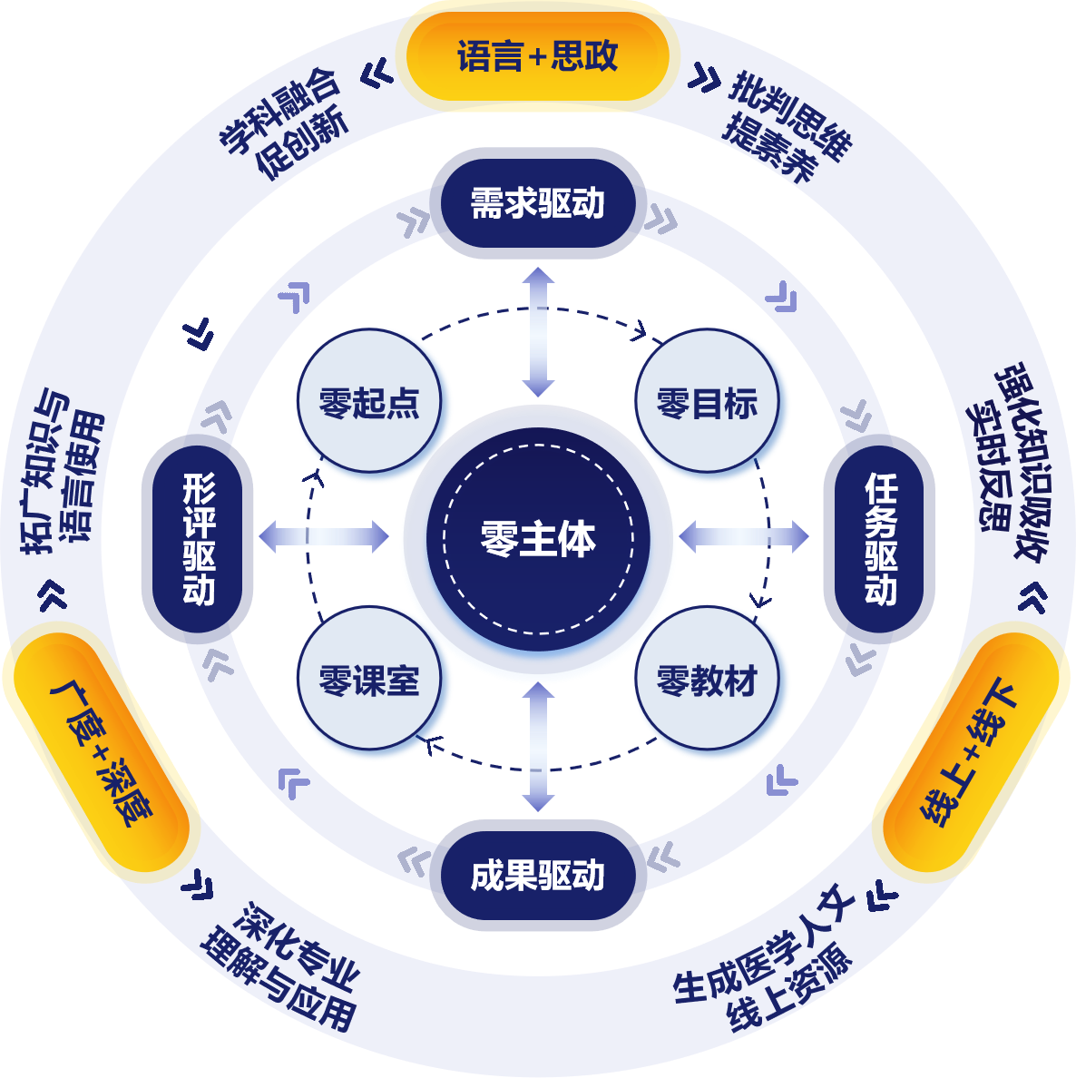 零度课程以学生为中心,构建一个开放、包容且富有弹性的教学环境。“零”不是没有,而是以空位的形式存在,老师和学生都可以成为课程的主讲者,成为课程主体(零主体);课程不设统一的课程目标,鼓励个性化学习,每个学生都有自己设定的目标,并随着课程进展,每个人的目标不断更新迭代(零目标);课程不预设固定的学习起点,而是根据学生个体差异和先前的知识经验定制学习路径,学生根据自己的实际情况和兴趣选择学习的起点(零起点);课程不再拘泥于固定的教材,在线资源、多媒体材料、实际案例都可以成为课程内容并不断生成新形态(零教材);课程打破传统教室作为学习唯一场所的限制,打破时空,实现泛在学习大课堂,随时随地学习(零课室)。“需求驱动”、“任务驱动”、“成果驱动”、“评价驱动”四个驱动推动实现五个“零”。