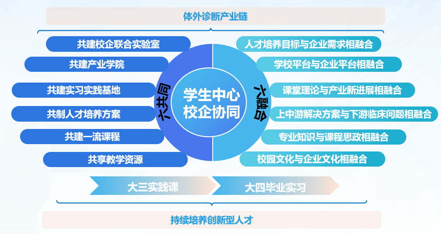 六共同为校企共建联合实验室、共建产业学院、共建实习实践基地、共同制定人才培养方案、共建一流课程、共享教学资源,六融合为人才培养目标与企业需求相融合、学校平台与企业平台相融合、课堂理论与产业新进展相融合、上中游解决方案与下游临床问题相融合、专业知识与课程思政相融合、校园文化与企业文化相融合。通过这一教学模式,团队将体外诊断产业链贯穿课程始终,学生的培养也从大三的实践课延伸到了大四的毕业实习,达成了持续培养创新型人才的育人目标。