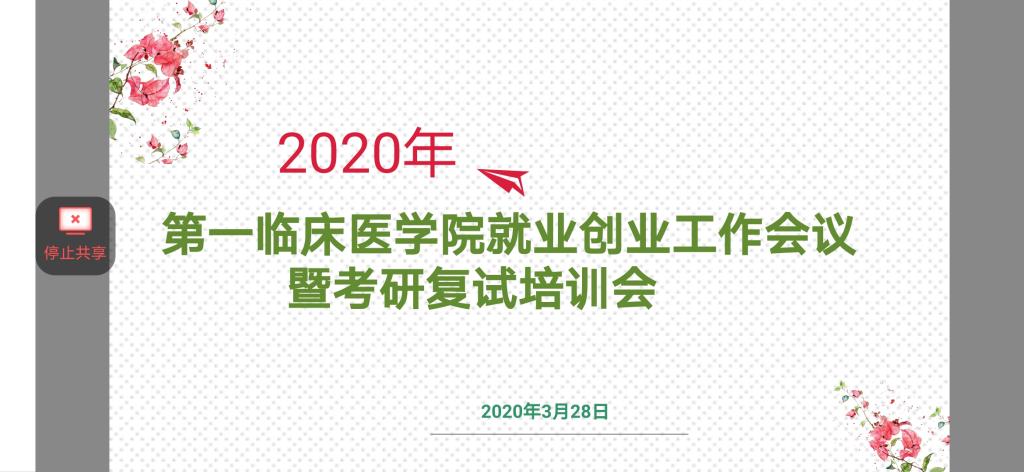 为更好地帮助毕业生的升学和就业,助力学院考研学子顺利通过复试,3月28日,第一临床医学院开展线上就业创业工作会议暨考研复试培训会。研究生学院院长唐焕文、第一临床医学院党委书记黄然、院长张良清、副书记陈晓光、新葡萄附属医院培训部部长李书安、姚岚老师,大内科主任周宇,大外科主任柳建军、妇产科主任张颖、儿科主任黄宇戈、2018届学生梁晓杰以及近300名应届考研学子参与会议。会议由第一临床医学院2015级辅导员蔡晓颖主持。